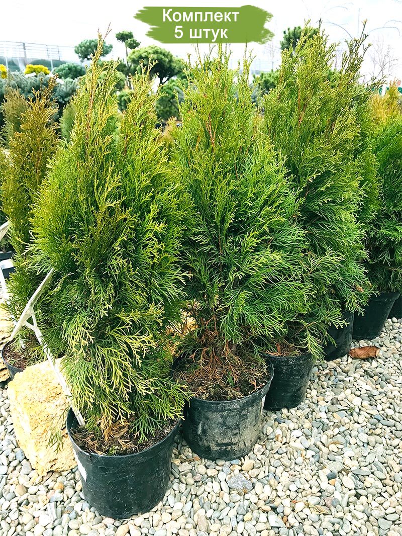 Набор из пяти туй сорта "Смарагд" размером от 60 до 100 см предлагается по привлекательной цене, эквивалентной стоимости четырех. Туя западная "Смарагд" отличается элегантной и пышной кроной, при этом она занимает относительно небольшое пространство. Взрослое растение может достигать высоты до 6 метров, а его крона в случае отсутствия регулярной обрезки может распространяться на 2 метра в ширину. Этот вид туи известен своей долговечностью, ведь средний срок ее жизни составляет около 130 лет. Туя растет относительно медленно, прибавляя ежегодно 15-20 см в высоту и около 5 см в ширину. Особенно активный рост наблюдается сразу после посадки, когда молодые ветви активно формируют крону, а корни укрепляются в новой почве.